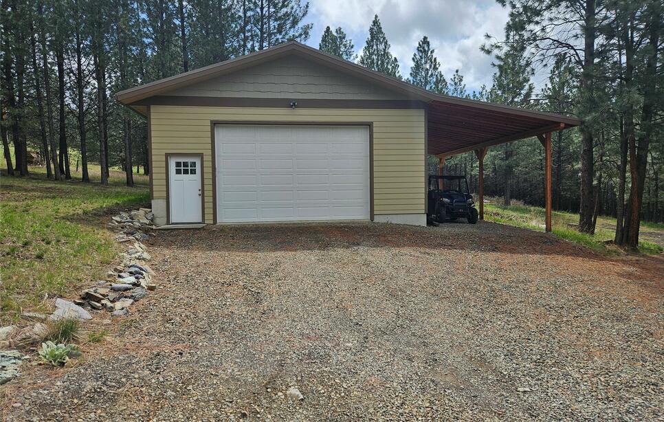 Built recently a 28 ft X 32 ft double car garage with a 14 ft x 10 ft overhang/lean-to on just over an acre of land. Great forested location, perfect for RV use/storage. Insulated, drywalled and taped. Complete with a wood stove and hooked up to power. No well or septic but DEQ is already completed. Located on a private road just outside of town and a short walk to an extensive recreational trail system.