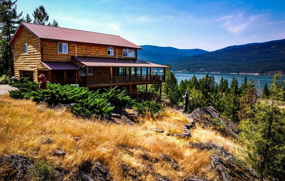 Perched on the rocky bluffs above Lake Koocanusa, with endless views that span from the mountains to the waters edge, this property is designed to lift you above the trees and into the big sky, immersing you in Northwest Montana's natural landscape. The three-story carefully-crafted log cabin is situated at the edge of a private forest and just above a forest service boundary, providing ample privacy and easy access to the quiet shoreline beneath you. Inside, the windows boast endless lake views from every angle of the house, making this property one of a kind. Step out onto the double wraparound covered decks, and let the views of the Canadian Rockies and sounds of the serene lake waters take your breath away. Follow the established game trails to the sandy shores for a nice hike and refreshing swim. Take relaxing under the stars to a new level while soaking in the hot tub situated among natural rock outcroppings. Designed for entertaining, the property consists of a main lodge and a modern barndominium that can function as luxurious guest quarters or a unique vacation rental. The cabin has 4 bedrooms and 4 baths, and the barndominium boasts 2 bedrooms, 2 baths and bonus rooms with abundant space. The barn is designed to meet all your boat and toy storage needs and has an additional attached garage and carport. Located minutes from Abayance Bay Marina, this property offers easy access to boating, waterfront dinners and popular summer concerts. This stunning mountain retreat is truly the last of its kind.