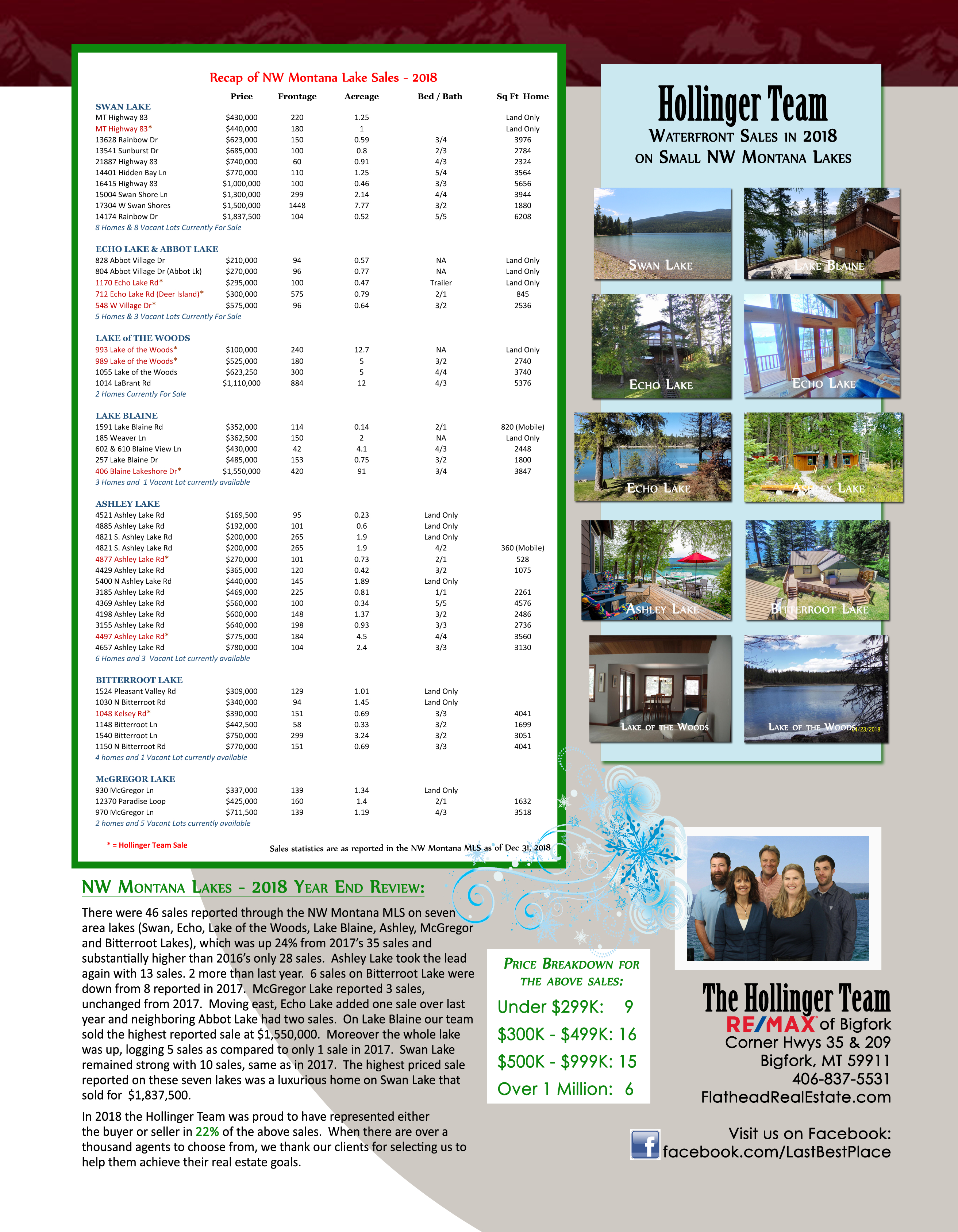 NW Montana lakes had an upswing overall in sales over 2018. Here is our winter newsletter with a recap of all the sales on Swan Lake, Echo Lake, Lake Blaine, Lake of the Woods, Ashley Lake, Bitterroot Lake and McGregor Lake along with some commentary about the market.