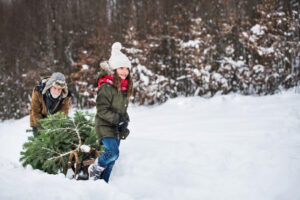 Tools you might want to consider bringing with you include a measuring tape to ensure you select a tree that fits in your home; a handsaw to cut your tree; gloves to protect your hands; boots to protect your feet; a tarp to sit on and/or to move your tree once it’s cut; and rope or straps to secure your tree to your vehicle.
