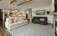 Step into a bright, open living room featuring a natural gas brick fireplace that serves as a stunning focal point. The space is complemented by fresh carpet less than two years old, creating a cozy, welcoming atmosphere. A TV is mounted above the fireplace, perfect for entertainment, while French doors lead out to a back porch with durable Trek decking, offering breathtaking mountain views. This living room combines comfort, style, and seamless indoor-outdoor living—ideal for relaxing or hosting gatherings.