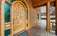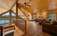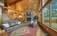 The entry experience is truly distinctive, centered around a custom-built 4' x 8' hand-carved cedar door featuring aqua-blue water glass—an artistic focal point in itself. Entry may be accessed via a covered ramp, porch, or curved staircase. Inside, the home opens to a dramatic 26-foot open beam ceiling, warm cedar finishes, a Montana river rock gas fireplace, and a striking oak spiral staircase, all complemented by custom lighting crafted by Scottsdale Art Factory.