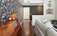 wood mantle and open kitchen shelving